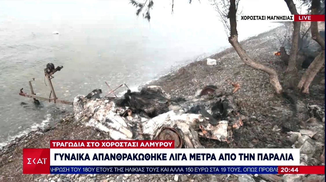 Ο κ. Χατζηκυριάκος είπε ότι το τροχόσπιτο βρισκόταν στα 5 μέτρα από τη θάλασσα και όταν ο ίδιος πήγε στην παραλία με τους πυροσβέστες το τροχόσπιτο ήταν καμένο ολοσχερώς, ο σύζυγος της άτυχης γυναίκας που κάηκε βρισκόταν σε ένα πεζούλι δίπλα από τη θάλασσα και τους είπε ότι «μάλλον η γυναίκα μου κάηκε».