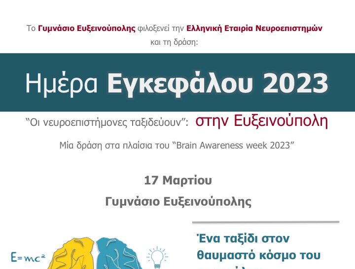 Το Γυμνάσιο Ευξεινούπολης φιλοξενεί την Ελληνική Εταιρία Νευροεπιστημών και τη δράση «Ημέρα Εγκεφάλου 2023». Πρόκειται για μία δράση στο πλαίσιο του «Brain Awareness week 2023» και η οποία θα υλοποιηθεί στις 17 Μαρτίου.