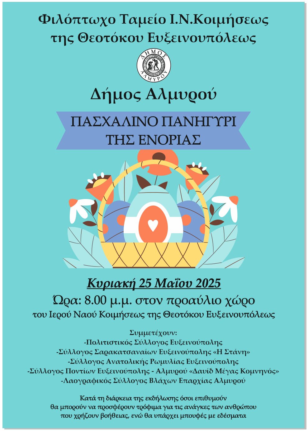 Το Φιλόπτωχο Ταμείο του Ι.Ν. Κοιμήσεως της Θεοτόκου Ευξεινούπολης και ο Δήμος Αλμυρού διοργανώνουν το «Πασχαλινό Πανηγύρι της Ενορίας» την Κυριακή 25 Μαΐου και ώρα 8μμ στον προαύλιο χώρο του Ι.Ν. Κοιμήσεως της Θεοτόκου στην Ευξεινούπολη.