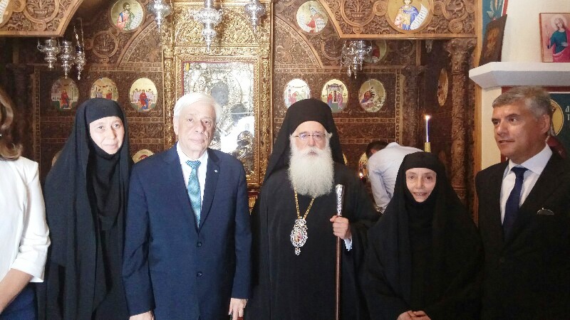 Στη συνέχεια, ο Σεβασμιώτατος και η Ηγουμένη ξενάγησαν τον κ. Πρόεδρο στους χώρους της Μονής, όπου επιτελούνται τα έργα της αναστήλωσης του μνημείου και ο κ. Παυλόπουλος εξέφρασε την χαρά και την ευαρέσκειά του για την πρόοδο των εργασιών και ευχήθηκε για την σύντομη ολοκλήρωση τους.