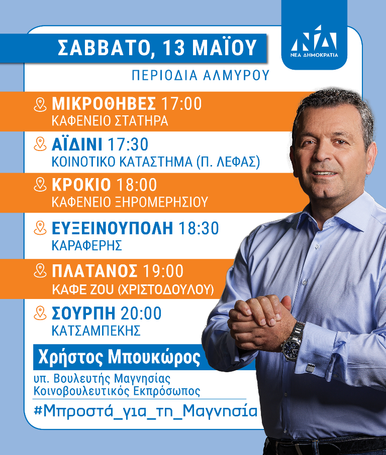 Το Σάββατο, 13 Μαΐου ο Χρήστος Μπουκώρος συνεχίζει την περιοδεία του και συγκεκριμένα θα επισκεφθεί τις Μικροθήβες στις 5 το απόγευμα όπου θα μιλήσει στο καφενείο Στατήρα, το Αϊδίνιο στις 5:30 το απόγευμα στο κοινοτικό κατάστημα, το Κρόκιο στις 6 το απόγευμα στο καφενείο του Ξηρομερήσιου. Θα ακολουθήσει επίσκεψη στην Ευξεινούπολη στις 6:30 το απόγευμα που θα μιλήσει στο καφέ Καραφέρη, στον Πλάτανο στις 7 το απόγευμα στο CAFE ZOU (Χριστοδούλου) και τέλος στην Σούρπη στις 8 το απόγευμα στο κατάστημα του Κατσαμπέκη