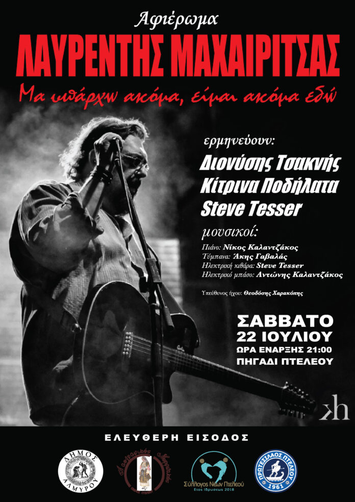 Τέλος, το Σάββατο 22 Ιουλίου, στις 21.00 στο Πηγάδι Πτελεού θα γίνει αφιέρωμα στον Λαυρέντη Μαχαιρίτσα από τον Διονύση Τσακνή, τα Κίτρινα Ποδήλατα και τον Steve Tesser. Η είσοδος για το κοινό είναι ελεύθερη.