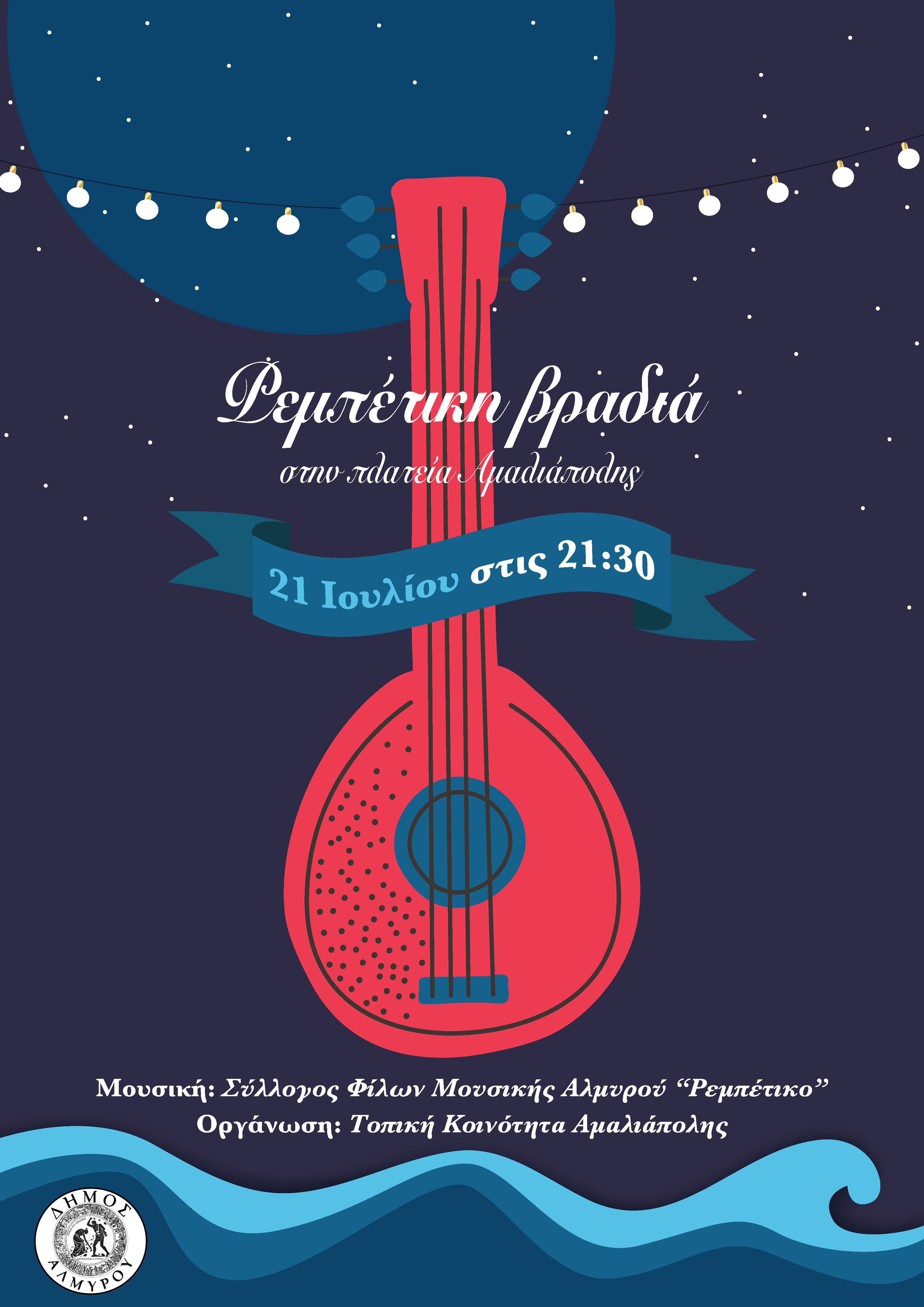 Την Παρασκευή 21 Ιουλίου στις 21.30 στην πλατεία Αμαλιάπολης διοργανώνεται Ρεμπέτικη Βραδιά, από την Τοπική Κοινότητα Αμαλιάπολης. Η μουσική στην εκδήλωση είναι του Συλλόγου Φίλων Μουσικής Αλμυρού «Ρεμπέτικο».