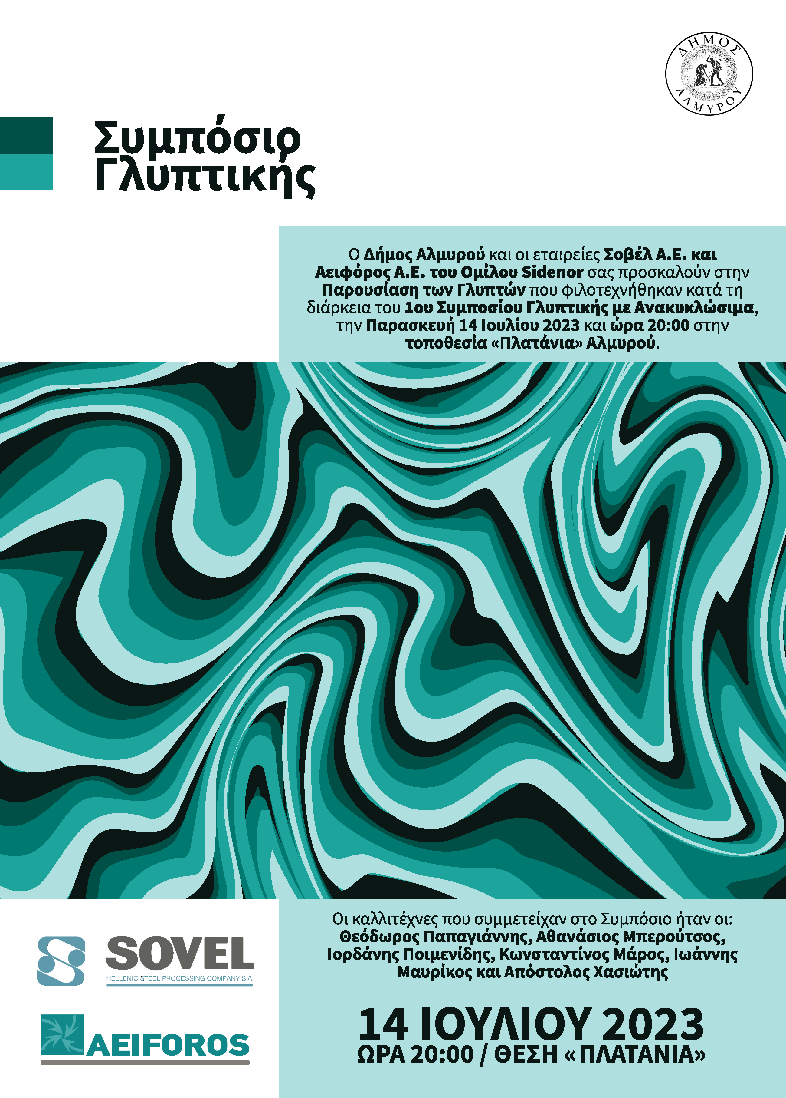 Θα προηγηθεί την Παρασκευή 14 Ιουλίου στις 20.00 θα γίνει στη θέση Πλατάνια Αλμυρού το 1ο Συμπόσιο Γλυπτικής να ανακυκλώσιμα που συνδιοργανώνουν ο Δήμος Αλμυρού και οι εταιρίες SOVEL Α.Ε. και Αειφόρος Α.Ε. του Ομίλου Sidenor. Στο Συμπόσιο θα συμμετάσχουν έξι καλλιτέχνες.