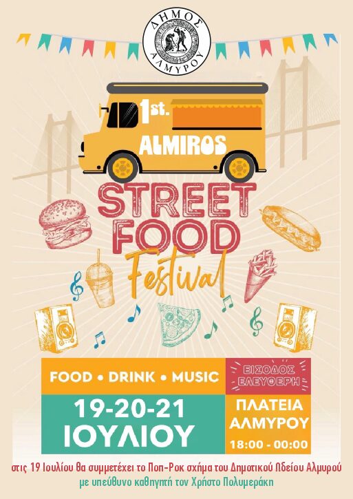 Το πρώτο Street Food Festival διοργανώνει το τριήμερο 19,20 και 21 Ιουλίου ο Δήμος Αλμυρού στην κεντρική πλατεία με είσοδο ελεύθερη, όπου οι παρευρισκόμενοι θα έχουν τη δυνατότητα να απολαύσουν πλήθος γεύσεων.