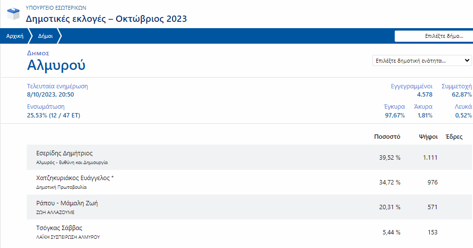 Ο πρώην δήμαρχος Δημήτρης Εσερίδης προηγείται μετά την καταμέτρηση των ψήφων σε 12 από τα 47 τμήματα του Δήμου Αλμυρού.