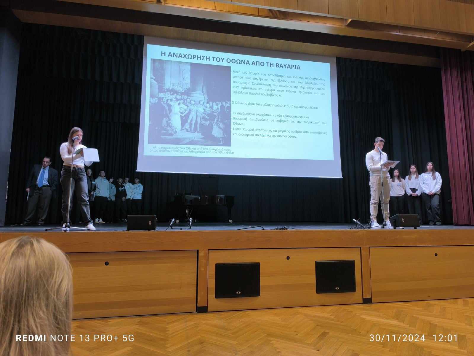 Παρόλο που στην ιστορία έμεινε γνωστός ως έκπτωτος βασιλιάς, οι μαθητές μελέτησαν και ανέδειξαν και κάποια άλλη ιστορική πτυχή: τον ειρηνόφιλο ηγεμόνα Όθωνα και Μαικήνα (προστάτη) των Τεχνών. Η παρουσίαση των μαθητών ολοκληρώθηκε με στίχους του Νίκου Γκάτσου σε μουσική του Σταύρου Ξαρχάκου. Οι μαθήτριες χόρεψαν το ωραίο τραγούδι «Στου Όθωνα τα χρόνια», συγκινώντας και ξεσηκώνοντας τους παρευρισκόμενους μαθητές και καθηγητές, οι οποίοι τους καταχειροκρότησαν.