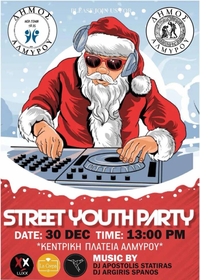 Το Συμβούλιο Νέων και ο Δήμος Αλμυρού διοργανώνουν Street Party την Δευτέρα 30 Δεκεμβρίου 2024 και ώρα 1 το μεσημέρι στην Κεντρική Πλατεία της πόλης με φαγητό, ποτό και -κυρίως- γιορτινή διάθεση.