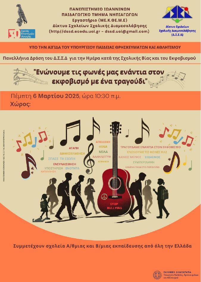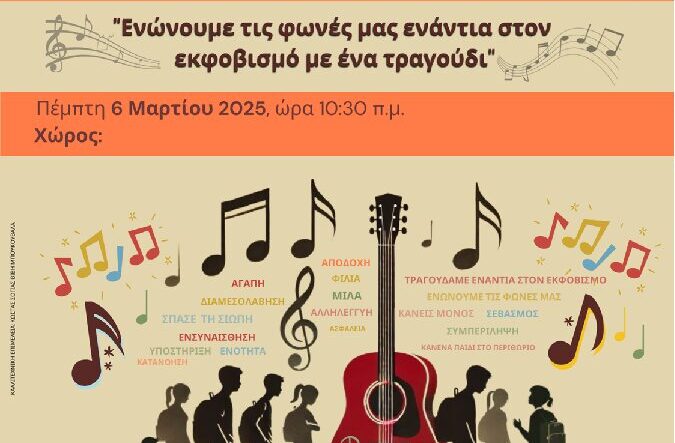 Η εκδήλωση, με τίτλο “Ενώνουμε τις φωνές μας ενάντια στον εκφοβισμό με ένα τραγούδι”, θα περιλαμβάνει τη συμμετοχή σχολείων απ’ όλη την Ελλάδα, τα οποία έχουν δημιουργήσει το καθένα το δικό του πρωτότυπο τραγούδι με στίχους που προάγουν τη συμπερίληψη και την αλληλεγγύη. Οι μαθητές θα παρουσιάσουν τα τραγούδια τους στον χώρο του σχολείου τους, μεταδίδοντας μέσα από τη μουσική ένα ισχυρό μήνυμα κατά της σχολικής βίας και του εκφοβισμού. Παράλληλα, θα πραγματοποιηθούν δημιουργικές δράσεις όπως ζωγραφική προσφέροντας στους μαθητές επιπλέον ευκαιρίες να εκφράσουν τις σκέψεις και τα συναισθήματά τους για το ζήτημα.