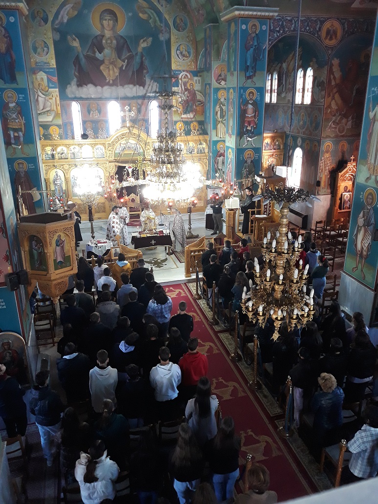 Η Θεία Λειτουργία τελέστηκε στον Σολέα του ναού ώστε οι μαθητές να βλέπουν και να κατανοούν τα τελούμενα στο μυστήριο της Θείας Ευχαριστίας. Την επεξήγηση των τελούμενων της Θείας Λειτουργίας πραγματοποίησε ο Θεολόγος κ. Τσιτσιρίγκας Σωτήριος.