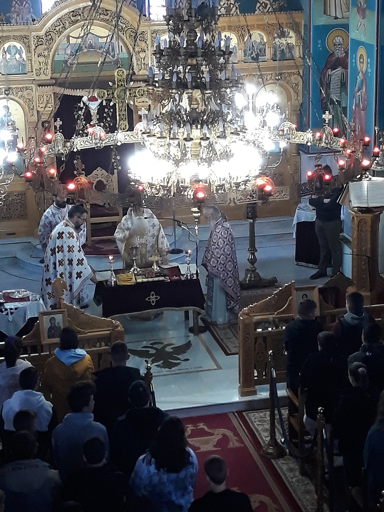 Οι μαθητές παρακολούθησαν με ενδιαφέρον και κατάνυξη την υποδειγματική Θεία Λειτουργία. Ο Μητροπολίτης κ.κ. Ιγνάτιος συνεχάρη τους μαθητές και εκπαιδευτικούς για την απόλυτη ησυχία και την προσοχή τους σε όλη την Θεία Λειτουργία και τους ευχήθηκε να έχουν υγεία και να περάσουν τις Άγιες ημέρες του Πάσχα με αγάπη.