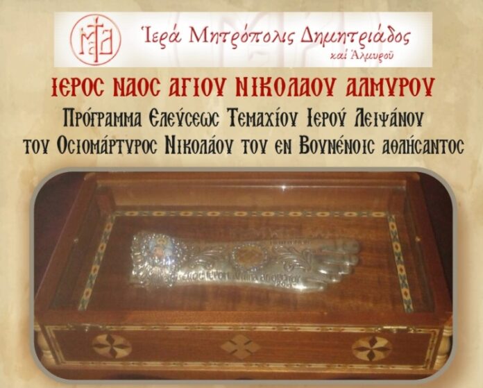 Στην Ιερά Μητρόπολη Δημητριάδος επίκεντρο του εορτασμού θα είναι ο ομώνυμος Ιερός Ναός του Αλμυρού, ο οποίος θα υποδεχθεί και θα φιλοξενήσει τεμάχιο του Λειψάνου του Αγίου Νικολάου του εν Βουνένοις. Η επίσημη υποδοχή θα πραγματοποιηθεί την Παρασκευή 17/5, στις 6.30μ.μ. και θα ακολουθήσει Ιερή Παράκληση.