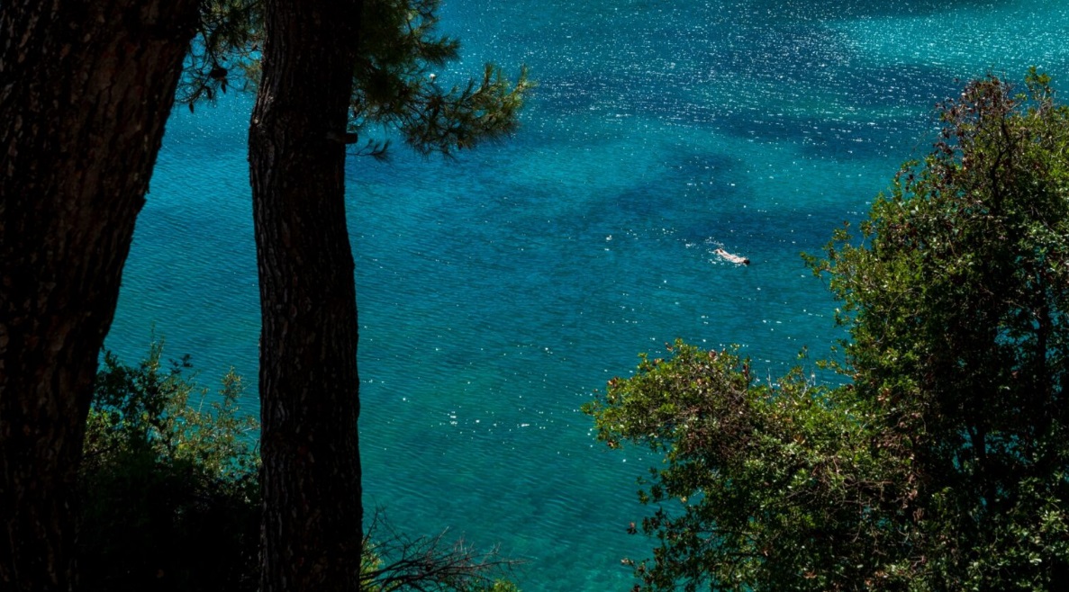 Ο κόκκινος βράχος που μπαίνει βαθιά μέσα στη θάλασσα συνδυάζεται αρμονικά με τα πράσινα δέντρα των λόφων, το καταγάλανο νερό, τις πέτρες, τα βότσαλα και την άμμο της παραλίας, που συνδυάζουν διάφορες αποχρώσεις – από το γκρι, στο άσπρο και στο κίτρινο. Η παραλία διαθέτει ξαπλώστρες και αρκετό ελεύθερο χώρο για την ομπρέλα σας, αλλά θεωρούμε ότι την καλύτερη σκιά προσφέρουν τα πεύκα.
