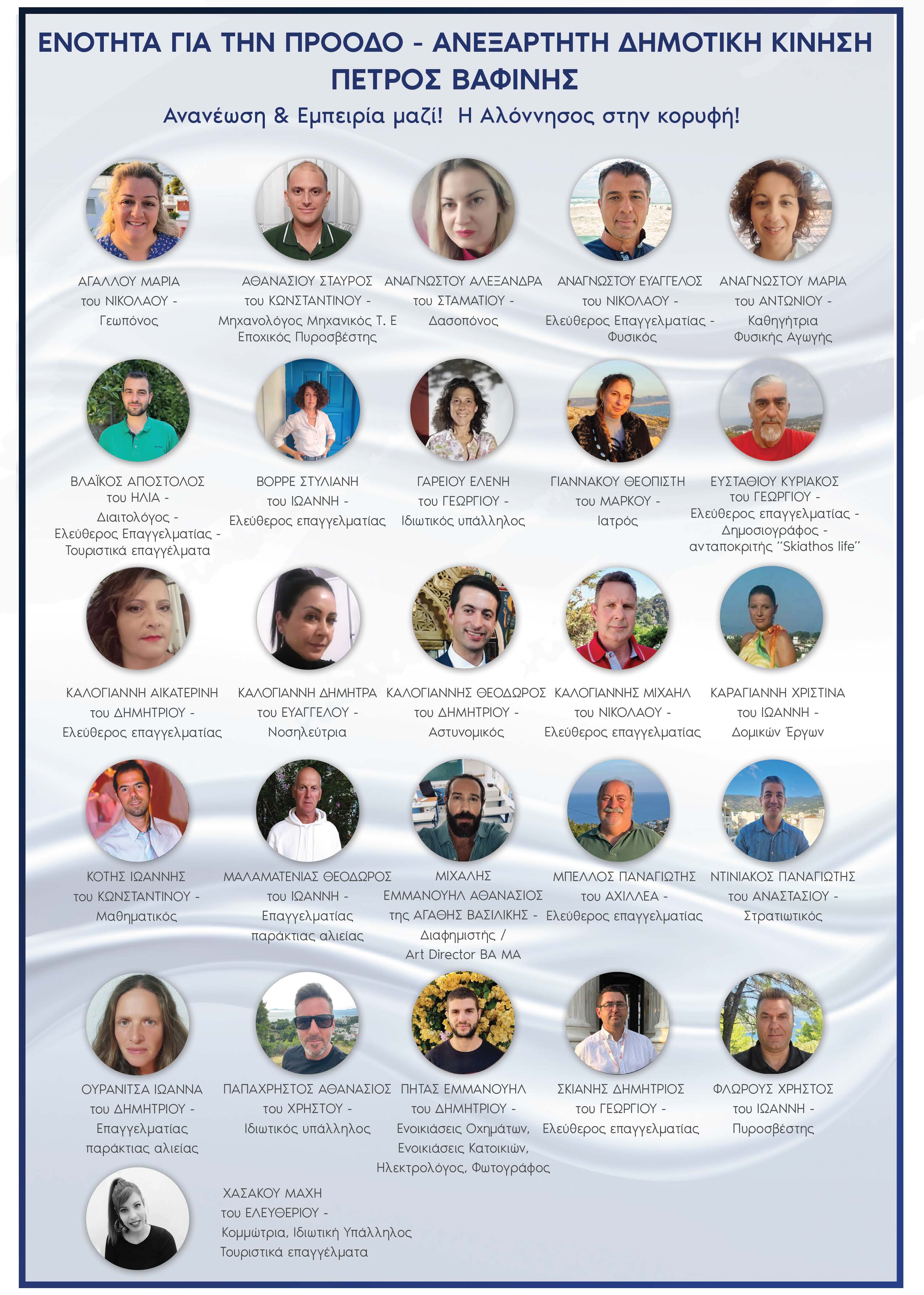Τον συνδυασμό του για τις επερχόμενες δημοτικές εκλογές, παρουσιάζει ο νυν δήμαρχος και εκ νέου υποψήφιος κ. Πέτρος Βαφίνης, με επιστολή που απέστειλε στον τοπικό Τύπο. Όπως αναφέρει, «έχω την χαρά και την τιμή να σας παρουσιάσω τους υποψήφιους δημοτικούς συμβούλους της παράταξης «Ενότητα για την Πρόοδο – Ανεξάρτητη Δημοτική Κίνηση» για την Αλόννησο.