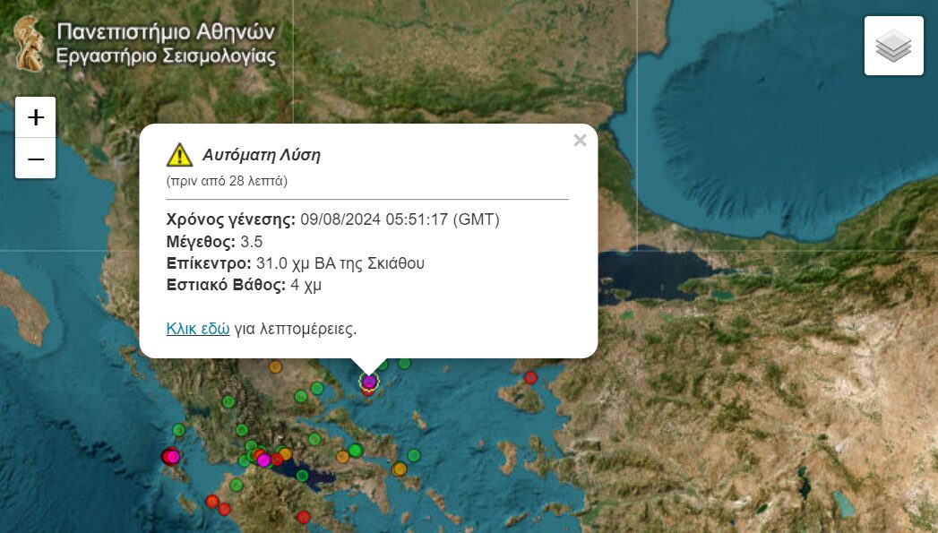 Σεισμική δόνηση μεγέθους 3,5 βαθμών της κλίμακας Ρίχτερ σημειώθηκε σήμερα στις 7:51 το πρωί μεταξύ Σκοπέλου και Αλοννήσου . Συγκεκριμένα, το επίκεντρο του σεισμού εντοπίστηκε 31 χλμ βορειοανατολικά της Σκιάθου και το εστιακό βάθος ήταν μόλις 4 χλμ, σύμφωνα με το Εργαστήριο Σεισμολογίας του Πανεπιστημίου Αθηνών.