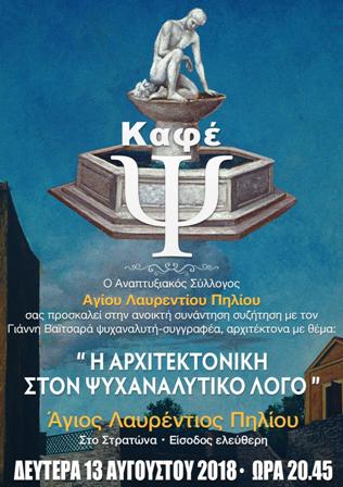 Ανοικτή συνάντηση-συζήτηση διοργανώνουν ο Αναπτυξιακός Σύλλογος Αγίου Λαυρεντίου Πηλίου και το «Καφέ Ψ», την Δευτέρα 13 Αυγούστου 2018, στον Άγιο Λαυρέντιο Πηλίου, ώρα 20.45, στο Στρατώνα, με θέμα «Η Αρχιτεκτονική στον ψυχαναλυτικό λόγο».