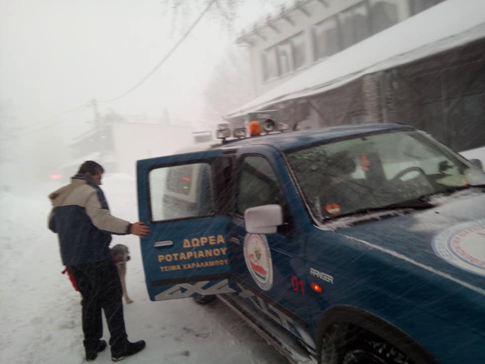 Εθελοντές της Λέσχης Ειδικής Δυνάμεων, παρέλαβαν την οικογένεια μέσα στη χιονοθύελλα με το διασωστικό όχημα της Λέσχης και τη μετέφεραν στο Βόλο.