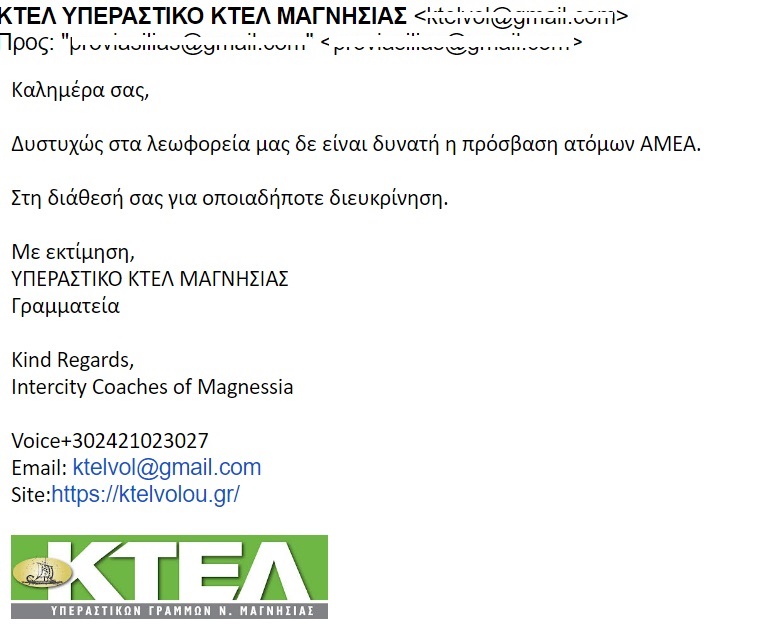 «Πρέπει να μεταβώ στην Αθήνα για να κάνω κάποιες εξετάσεις και δεν μπορώ να το κάνω ούτε με το ΚΤΕΛ, ούτε με τον ΟΣΕ. Έστειλα και επιστολή στο Υπεραστικό ΚΤΕΛ και μου απάντησαν ότι δεν υπάρχει πρόσβαση στα λεωφορεία για τα ΑμεΑ. Πως θα μετακινηθώ; Πρέπει να πληρώσω ΙΧ ή ταξί», ανέφερε εξοργισμένος ο ίδιος.