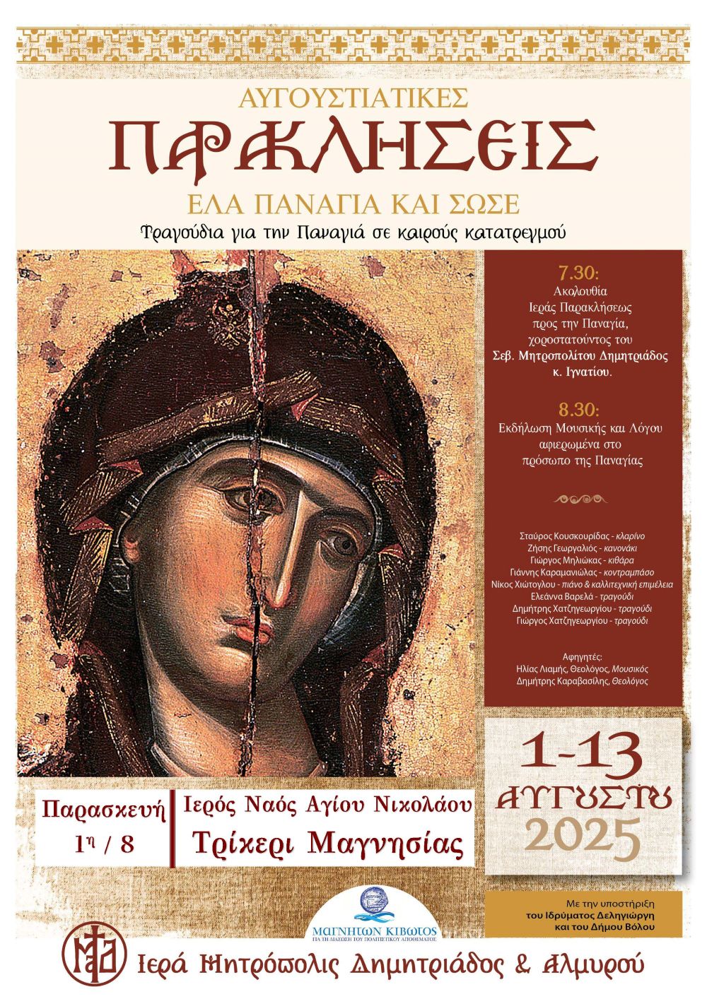 Από τον Ιερό Ναό Αγίου Νικολάου στο Τρίκερι αρχίζουν από αύριο 1η Αυγούστου οι «Αυγουστιάτικες Παρακλήσεις» που διοργανώνονται από τον Πολιτιστικό Φορέα της Ιεράς Μητροπόλεως Δημητριάδος και Αλμυρού «Μαγνήτων Κιβωτός, για τη διάσωση του πολιτικού αποθέματος» με την υποστήριξη του Ιδρύματος Δεληγιώργη και του Δήμου Βόλου .