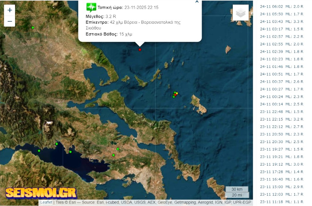 Ο σεισμός σημειώθηκε στις 22.15, με επίκεντρο 42 χλμ. βόρεια-βορειοανατολικά της Σκιάθου ήταν έντασης 3,2 της κλίμακας Ρίχτερ και είχε εστιακό βάθος 15 χλμ.