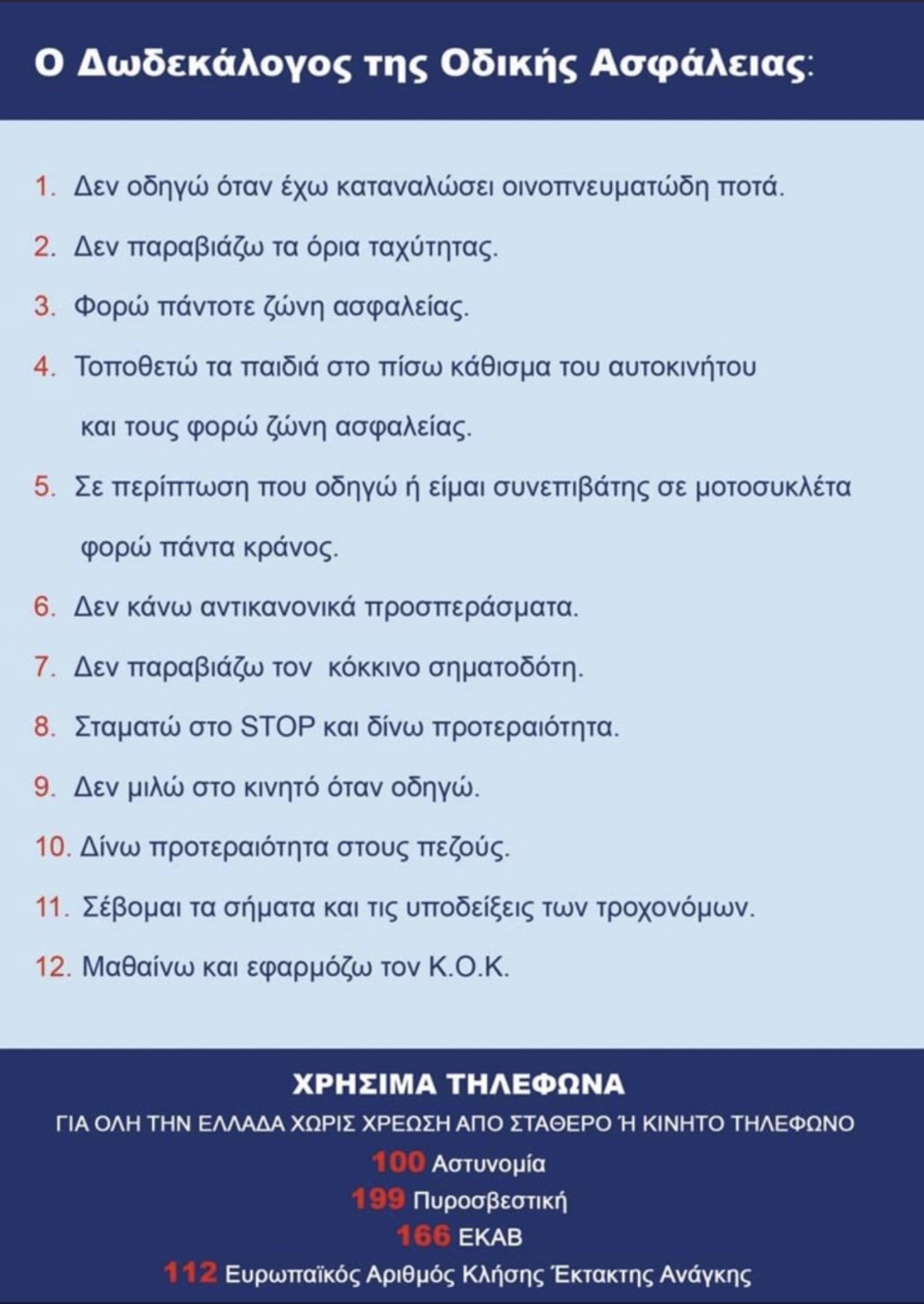 Όλοι οι οδηγοί θα πρέπει να είναι ιδιαίτερα προσεκτικοί, να κινούνται με ασφάλεια και να σέβονται τις διατάξεις του ΚΟΚ, με ιδιαίτερη προσοχή σε επικίνδυνες παραβάσεις όπως αντικανονική προσπέραση, χρήση κινητού, παραβίαση φωτεινού σηματοδότη και κατανάλωση αλκοόλ.