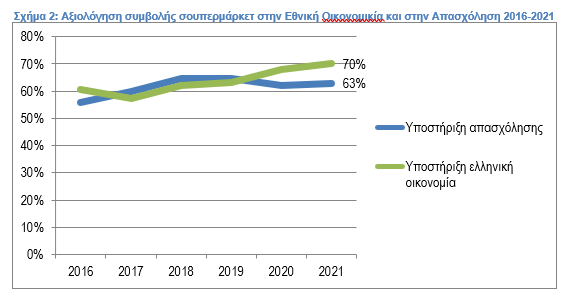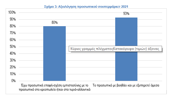 Θα πρέπει να σημειωθεί ότι διαχρονικά το προσωπικό των σουπερμάρκετ αποτελεί ένα από τα ανταγωνιστικά πλεονεκτήματα του κλάδου. Την περίοδο 2016-2021 σύμφωνα με τα στοιχεία της ετήσιας έρευνας καταναλωτών του ΙΕΛΚΑ το αγοραστικό κοινό αξιολογεί ιδιαίτερα θετικά τη συμβολή του σουπερμάρκετ στην απασχόληση σε ποσοστά της τάξης του 65%. Όπως φαίνεται στο σχήμα 3, το 93% του αγοραστικού κοινού θεωρεί ότι το προσωπικό των καταστημάτων βοηθάει τους καταναλωτές και τους εξυπηρετεί άμεσα, ενώ το 80% έχει προσωπική επαφή-σχέση εμπιστοσύνης με το προσωπικό στα σερβιριζόμενα τμήματα του καταστήματος, το κρεοπωλείου, τα τυριά και αλλαντικά.