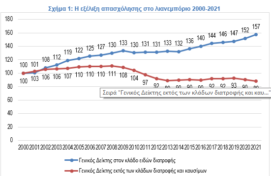 Συγκεκριμένα από την επεξεργασία των στοιχείων απασχόλησης που παρέχει σε τριμηνιαία βάση η ΕΛ.ΣΤΑΤ. προκύπτει ότι την περίοδο 2000-2021 το λιανεμπόριο τροφίμων παρουσιάζει αύξηση της απασχόλησης κατά 57%, σε αντίθεση με το υπόλοιπο λιανικό εμπόριο το οποίο παρουσιάζει μείωση κατά 11%. Πρακτικά το λιανεμπόριο τροφίμων το 2021 απασχολεί σχεδόν 80 χιλ. περισσότερους εργαζόμενους σε σχέση με το 2000 ξεπερνώντας τις 220 χιλ. άμεσα απασχολούμενους.