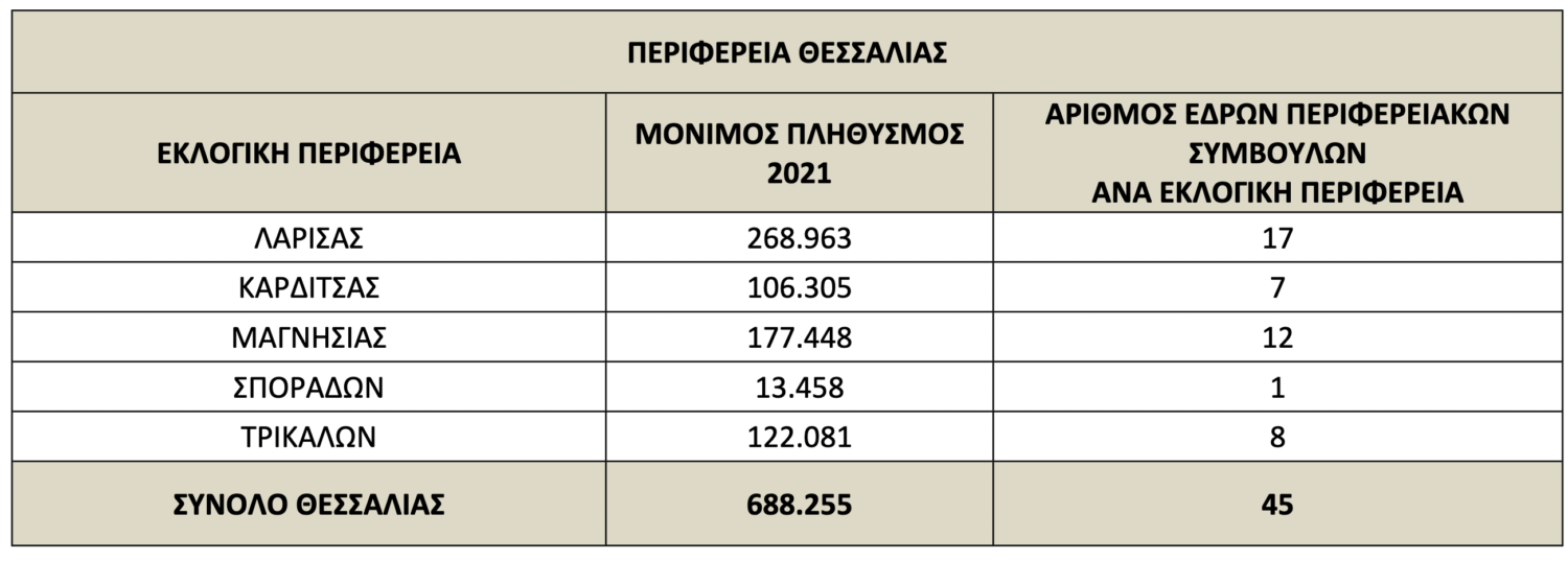 Σημαντικές αλλαγές σε ότι αφορά την κατανομή των εδρών ανά Περιφερειακή Ενότητα στο Περιφερειακό Συμβούλιο Θεσσαλίας προκύπτει από την απόφαση που υπογράφει ο αναπληρωτής υπουργός Εσωτερικών Θεόδωρος Λιβάνιος με θέμα «Ορισμός αριθμού εδρών περιφερειακών συμβούλων κάθε εκλογικής περιφέρειας, σύμφωνα με το άρθρο 51 του ν. 4804/2021, με βάση το μόνιμο πληθυσμό της, όπως προκύπτει από τα αποτελέσματα της Απογραφής Πληθυσμού-Κατοικιών έτους 2021 που αφορούν στο Μόνιμο Πληθυσμό της Χώρας». Η Μαγνησία με αυτή την απόφαση και εξαιτίας της μείωσης του μόνιμου πληθυσμού της χάνει έδρα, ενώ οι Σποράδες θα εξακολουθήσουν να εκπροσωπούνται από έναν περιφερειακό σύμβουλο.