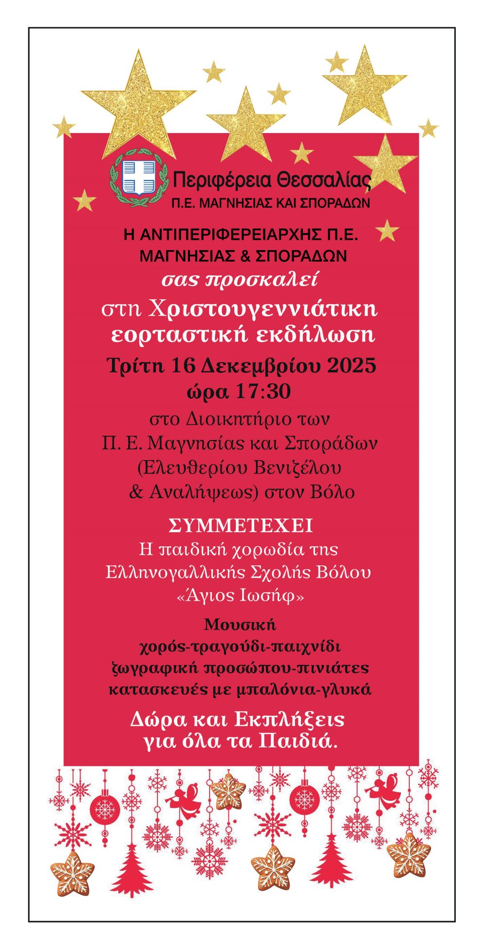 Χριστουγεννιάτικη εκδήλωση για τα παιδιά θα πραγματοποιηθεί στο διοικητήριο της Περιφερειακής Ενότητας Μαγνησίας την Τρίτη 16 Δεκεμβρίου στις 5.30 το απόγευμα. Θα συμμετέχει η παιδική χορωδία της Ελληνογαλλικής Σχολής Βόλου «Άγιος Ιωσήφ», ενώ το πρόγραμμα περιλαμβάνει, μουσική, τραγούδι, χορό, παιχνίδι, ζωγραφική προσώπου, μπαλόνια, γλυκά και δώρα για τα παιδιά.