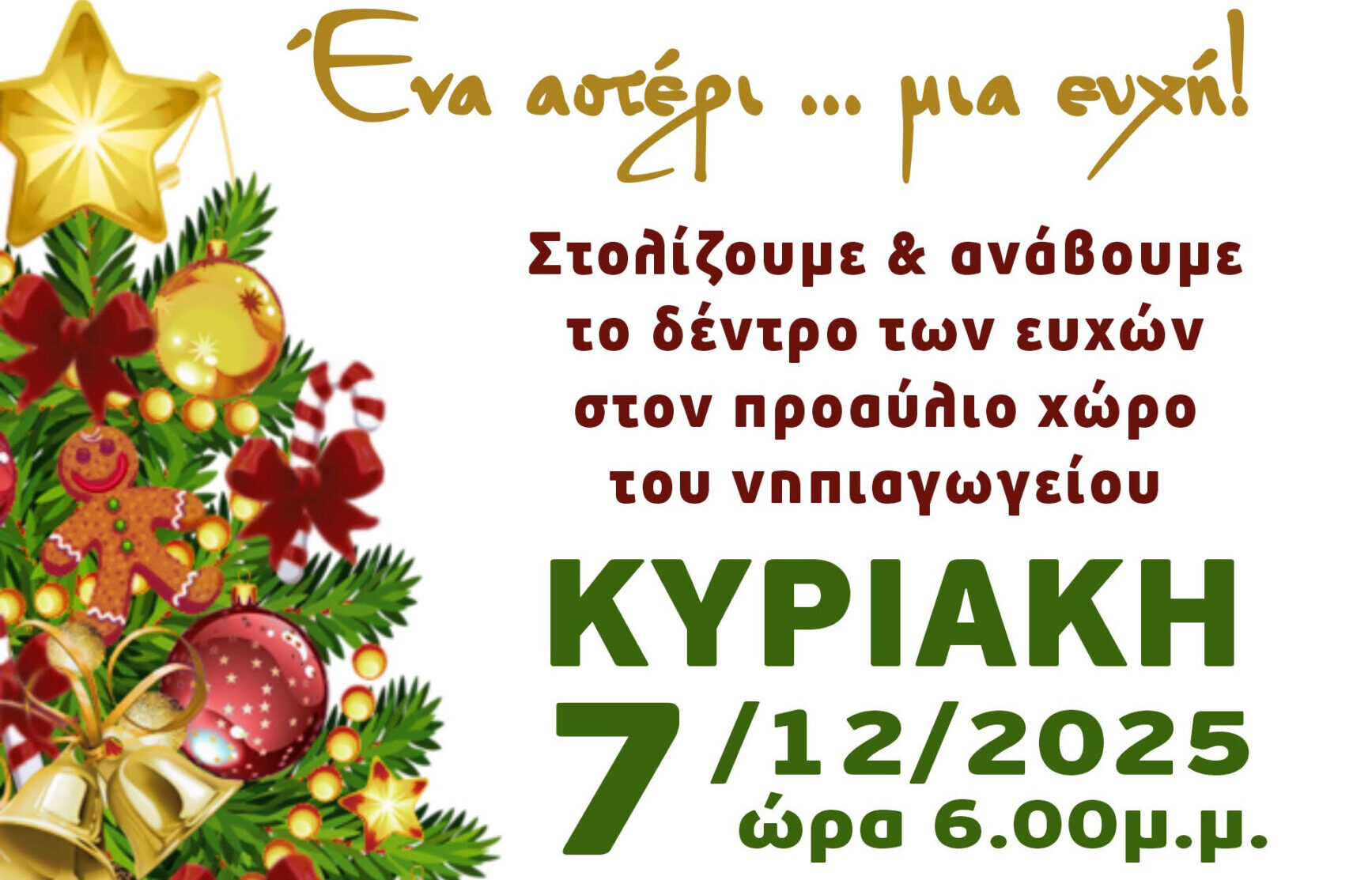 Ο πολιτιστικός σύλλογος Συκής «Γεώργιος Ρηματισίδης» προσκαλεί μικρούς και μεγάλους σε ένα ζεστό, γιορτινό χριστουγεννιάτικο απόγευμα. Την Κυριακή 7 Δεκεμβρίου 2025, στις 6:00 μ.μ., στον προαύλιο χώρο του νηπιαγωγείου, όσοι πάρουν μέρος στη γιορτή θα στολίσουν και θ’ ανάψουν το «Δέντρο των Ευχών», στο πλαίσιο της δράσης «Ένα αστέρι… μια ευχή!».