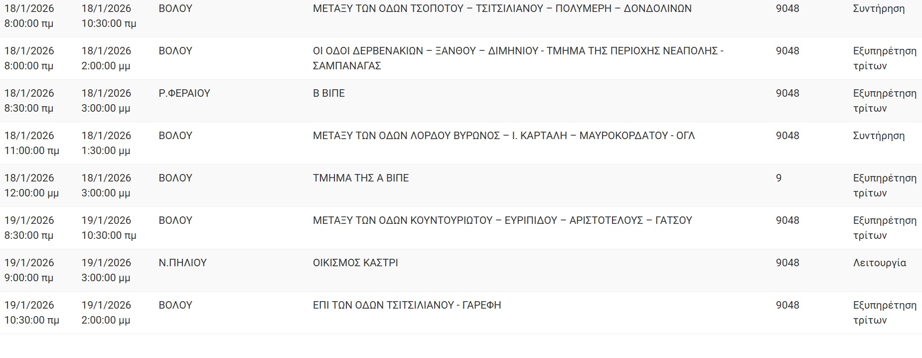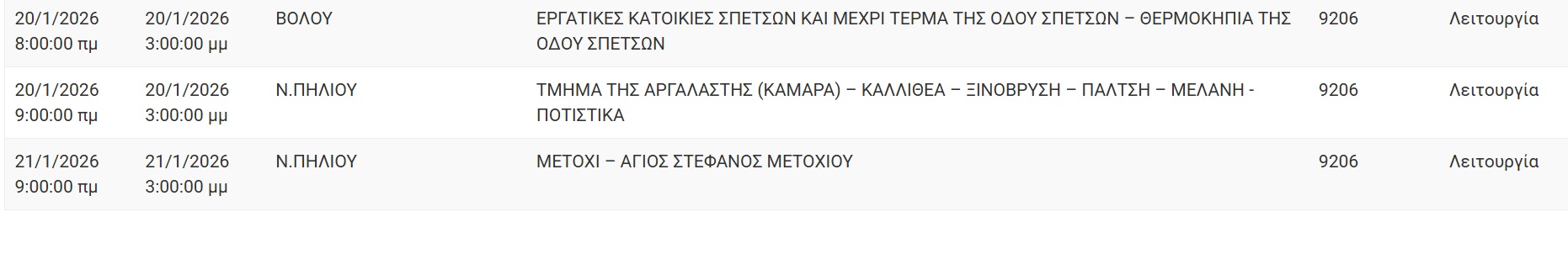 Διακοπές ηλεκτρικού ρεύματος θα σημειωθούν σε περιοχές του Βόλου και της Μαγνησίας, προκειμένου να εκτελεστούν απαραίτητες τεχνικές εργασίες του ΔΕΔΔΗΕ. Ειδοποιούνται οι κάτοικοι της παρακάτω περιοχής ότι, για να εκτελεσθούν οι απαραίτητες τεχνικές εργασίες της ΔΕΔΔΗΕ, θα γίνει διακοπή του ηλεκτρικού ρεύματος:
