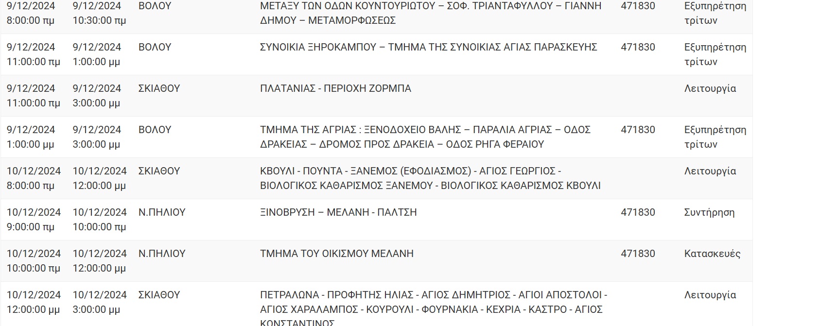 Διακοπές ηλεκτρικού ρεύματος θα σημειωθούν σε περιοχές της Μαγνησίας προκειμένου να εκτελεστούν απαραίτητες τεχνικές εργασίες του ΔΕΔΔΗΕ. Ειδοποιούνται οι κάτοικοι των παρακάτω περιοχών ότι, για να εκτελεσθούν οι απαραίτητες τεχνικές εργασίες της ΔΕΔΔΗΕ, θα γίνει διακοπή του ηλεκτρικού ρεύματος: