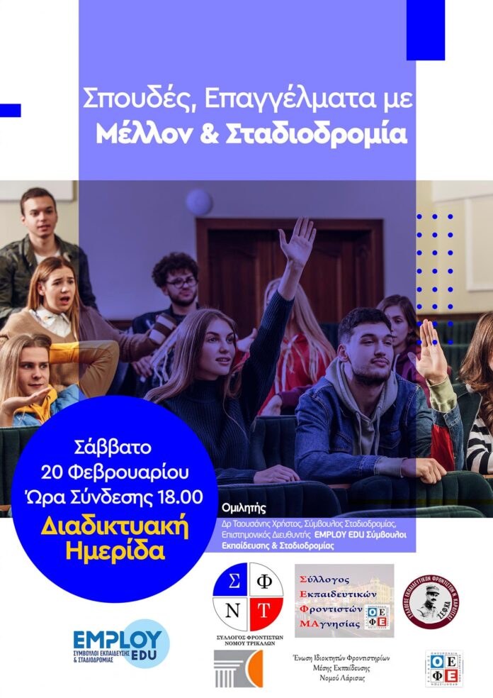 Οι Σύλλογοι Εκπαιδευτών Φροντιστών Λάρισας, Μαγνησίας, Τρικάλων και Καρδίτσας λαμβάνοντας υπόψη τις ανάγκες των μαθητών τους διοργανώνουν διαδικτυακό σεμινάριο Επαγγελματικού Προσανατολισμού με προσκεκλημένο ομιλητή το Δρ. Ταουσάνη Χρήστο, Διδάκτορα ΑΠΘ, σύμβουλο σταδιοδρομίας και συγγραφέα, και ιδρυτή της εταιρείας EMPLOY EDU Σύμβουλοι Εκπαίδευσης και Σταδιοδρομίας. Το σεμινάριο θα υλοποιηθεί το Σάββατο 20 Φεβρουαρίου στις 18:00.