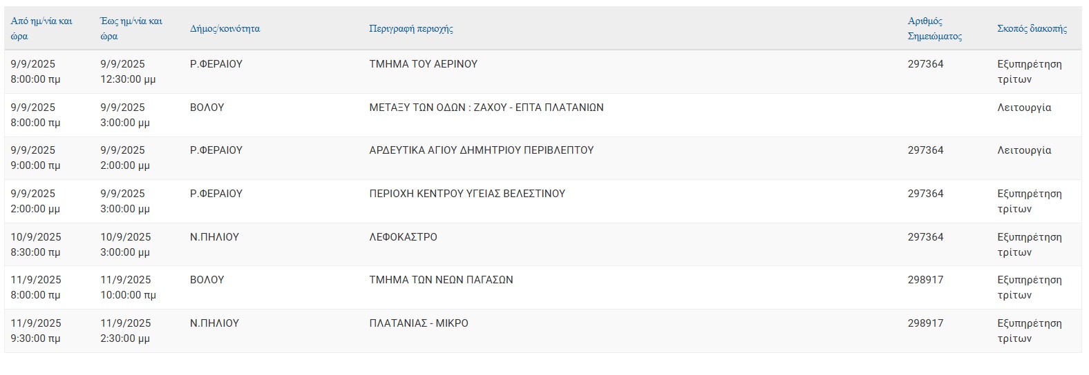 Διακοπές ηλεκτρικού ρεύματος θα σημειωθούν σε περιοχές της Μαγνησίας προκειμένου να εκτελεστούν απαραίτητες τεχνικές εργασίες του ΔΕΔΔΗΕ.