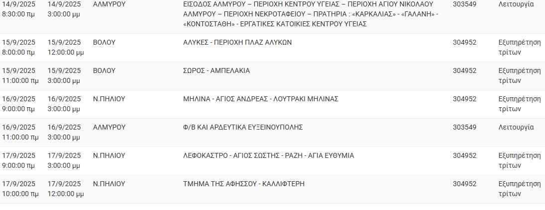 Ειδοποιούνται οι κάτοικοι των παρακάτω περιοχών ότι για να εκτελεσθούν οι απαραίτητες τεχνικές εργασίες της ΔΕΔΔΗΕ θα γίνει διακοπή του ηλεκτρικού ρεύματος: