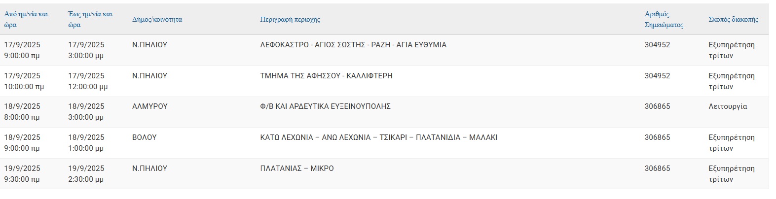 Διακοπές ηλεκτρικού ρεύματος θα σημειωθούν σε περιοχές της Μαγνησίας προκειμένου να εκτελεστούν απαραίτητες τεχνικές εργασίες του ΔΕΔΔΗΕ. Ειδοποιούνται οι κάτοικοι των παρακάτω περιοχών ότι για να εκτελεσθούν οι απαραίτητες τεχνικές εργασίες της ΔΕΔΔΗΕ θα γίνει διακοπή του ηλεκτρικού ρεύματος: