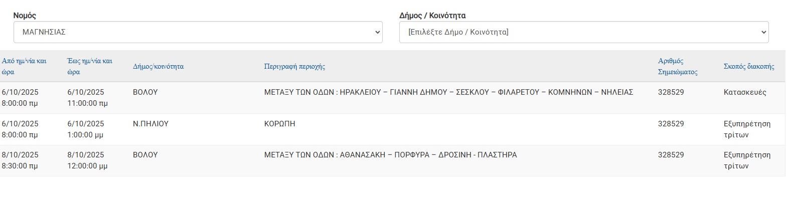Διακοπές ηλεκτρικού ρεύματος θα σημειωθούν σε περιοχές της Μαγνησίας προκειμένου να εκτελεστούν απαραίτητες τεχνικές εργασίες του ΔΕΔΔΗΕ. Ειδοποιούνται οι κάτοικοι των παρακάτω περιοχών ότι για να εκτελεσθούν οι απαραίτητες τεχνικές εργασίες της ΔΕΔΔΗΕ θα γίνει διακοπή του ηλεκτρικού ρεύματος: