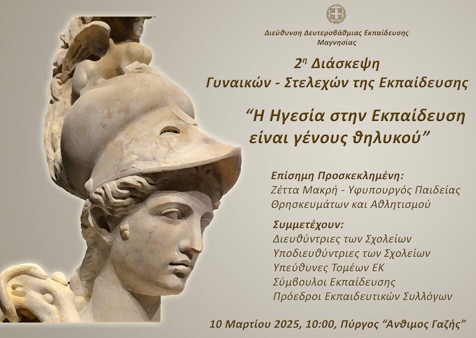 Η Διεύθυνση Δευτεροβάθμιας Εκπαίδευσης Μαγνησίας διοργανώνει τη 2η Διάσκεψη Στελεχών Εκπαίδευσης Δ.Δ.Ε. Μαγνησίας με αντικείμενο τον προσδιορισμό, την εξέταση, την ανάπτυξη και την αντιμετώπιση προκλήσεων της γυναίκας στην ηγεσία της εκπαίδευσης. Η Διάσκεψη έχει τον διακριτικό τίτλο «Η Ηγεσία στην Εκπαίδευση είναι γένους θηλυκού» και θα πραγματοποιηθεί τη Δευτέρα 10 Μαρτίου, στις 10.00 π.μ. στον 8ο όροφο του πύργου «Άνθιμος Γαζής» της Δ.Δ.Ε. Μαγνησίας.