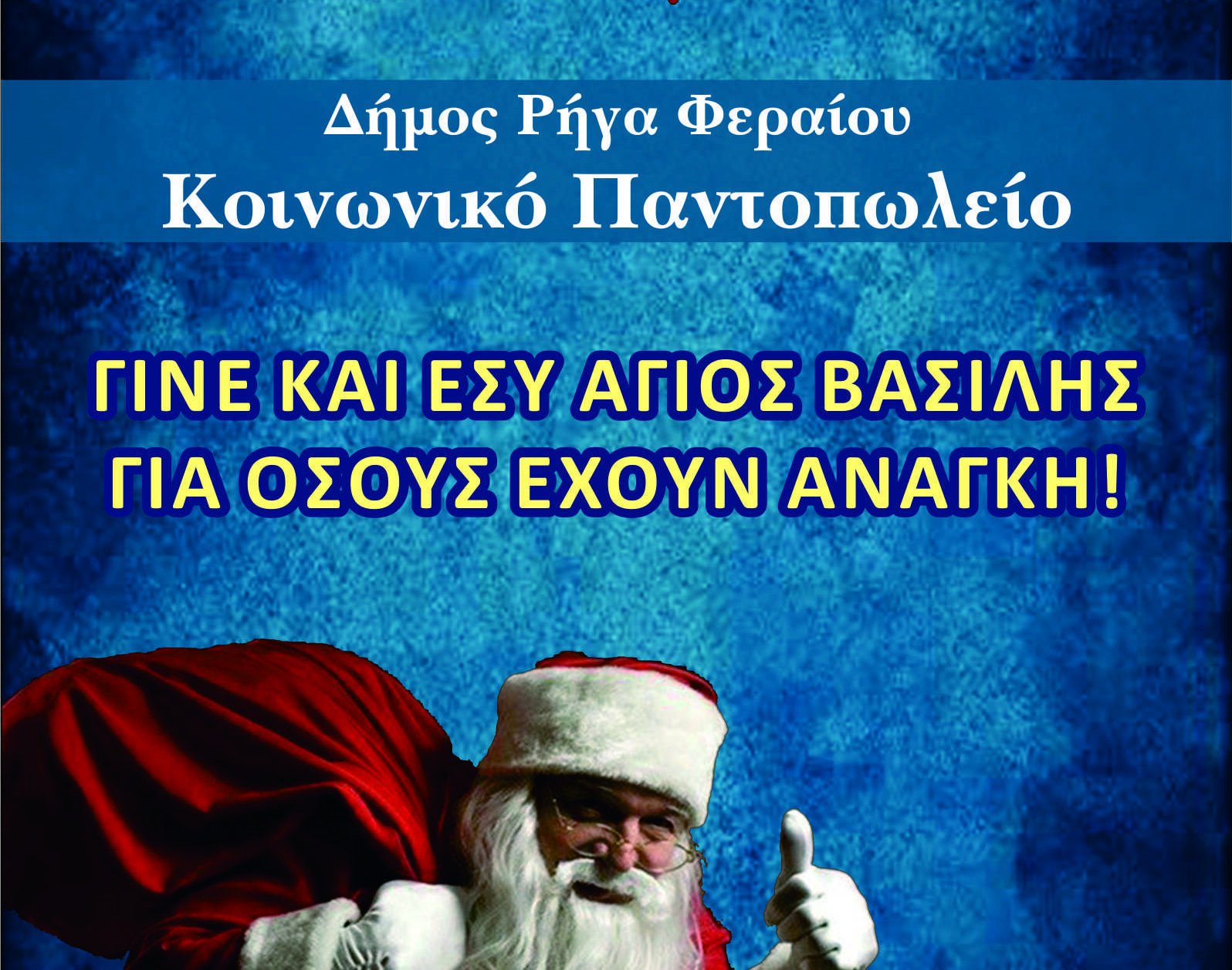 Με το μήνυμα “Γίνε και εσύ Άγιος Βασίλης για όσους έχουν ανάγκη”, ο Δήμος Ρήγα Φεραίου και οι Κοινωνικές δομές του πραγματοποιούν τον δεύτερο διαδικτυακό μαραθώνιο αγάπης και αλληλεγγύης για την ενίσχυση του Κοινωνικού Παντοπωλείου.