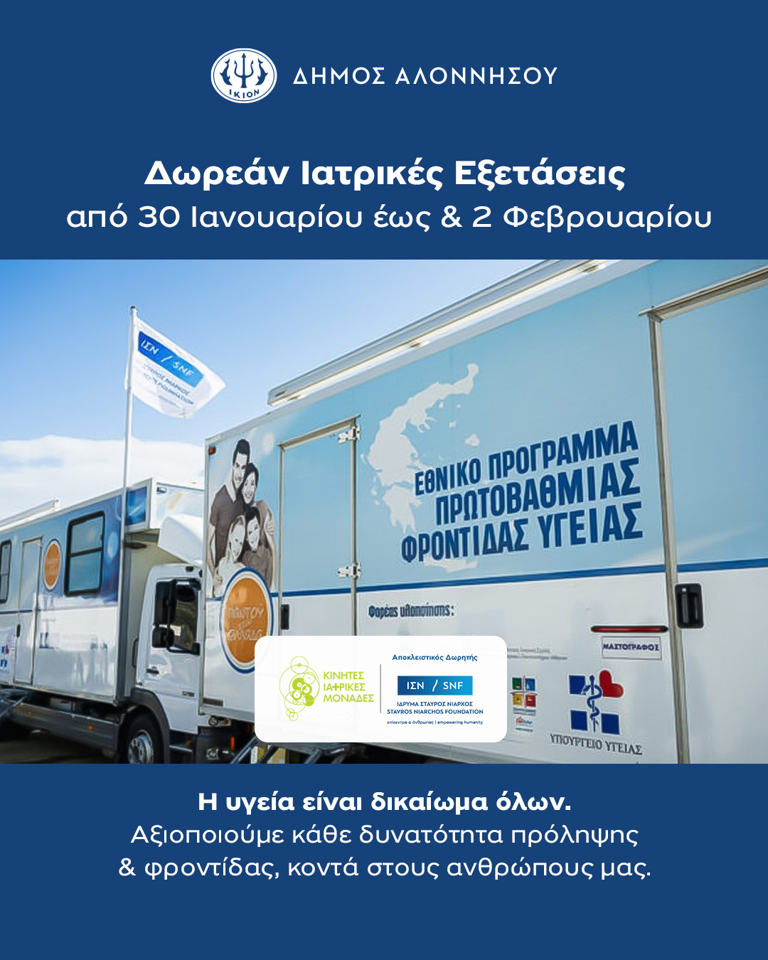 Ο Δήμος Αλοννήσου ενημερώνει τους κατοίκους του νησιού ότι, μετά από πρόσκληση του Δημάρχου Παναγιώτη Αναγνώστου, οι Κινητές Ιατρικές Μονάδες θα βρίσκονται στην Αλόννησο για δωρεάν προληπτικές και διαγνωστικές εξετάσεις, μοναδικό δωρητή το Ίδρυμα Σταύρος Νιάρχος.