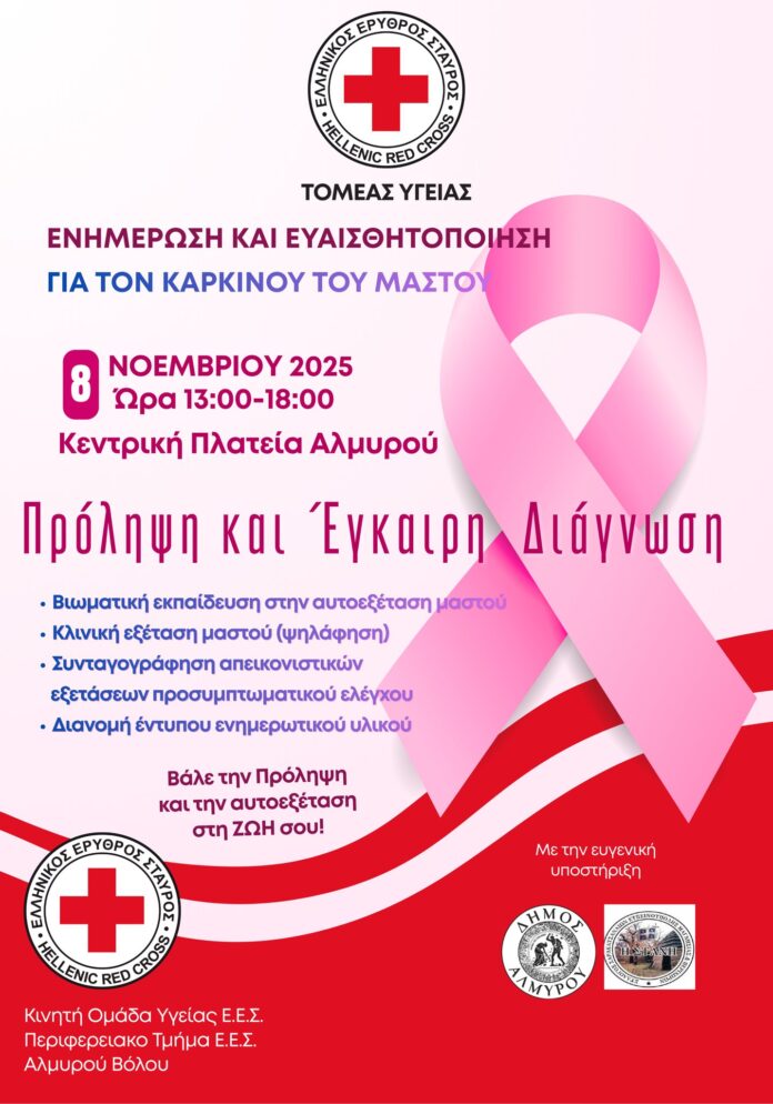 Ο Ελληνικός Ερυθρός Σταυρός, με την υποστήριξη του Δήμου Αλμυρού, διοργανώνει μια σημαντική ενημερωτική παράλληλη δράση για την πρόληψη του καρκίνου του μαστού. Η Κινητή ομάδα Υγείας και το Περιφερειακό Τμήμα ΕΕΣ Αλμυρού θα βρίσκονται το Σάββατο 8 Νοεμβρίου 2025, από τις 13:00 έως τις 18:00, στην κεντρική πλατεία του Δήμου Αλμυρού.