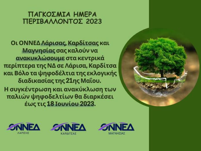 Οι ΟΝΝΕΔ Λάρισας, Καρδίτσας και Μαγνησίας με αφορμή την Παγκόσμια Ημέρα Περιβάλλοντος τη Δευτέρα 5 Ιουνίου 2023 κάλεσαν όλα τα μέλη και τους φίλους των Οργανώσεων να ανακυκλώσουν στα κεντρικά προεκλογικά περίπτερα της Ν.Δ σε Λάρισα, Καρδίτσα και Βόλο τα ψηφοδέλτια της προηγούμενης εκλογικής διαδικασίας της 21ης Μαΐου, τα οποία πλέον είναι άκυρα αφού στις εκλογές της 25ης Ιουνίου ψηφίζουμε με ΝΕΑ ψηφοδέλτια. Η συγκέντρωση και ανακύκλωση των παλαιών ψηφοδελτίων θα διαρκέσει έως τις 18 Ιουνίου 2023. Προστατεύουμε το περιβάλλον! Προστατεύουμε τις ζωές μας!