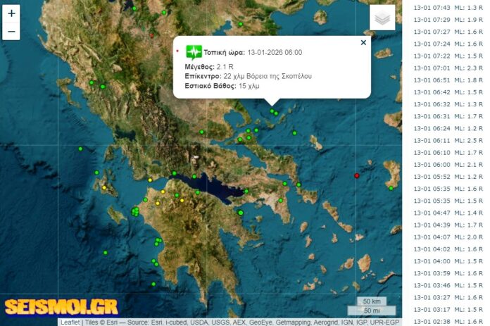 Στις 06.00 έγινε σεισμός έντασης 2,1 της κλίμακας Ρίχτερ με επίκεντρο 22 χλμ. Βόρεια της Σκοπέλου και σε εστιακό βάθος 15 χλμ.