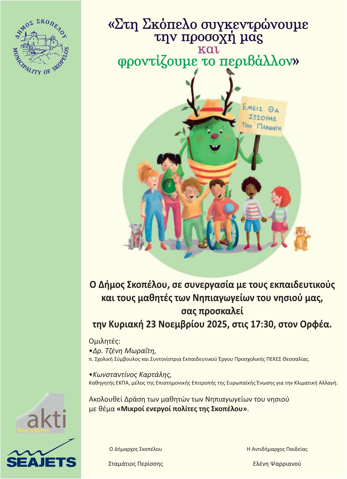 Ο Δήμος Σκοπέλου, σε συνεργασία με τις νηπιαγωγούς, τους μαθητές και τις μαθήτριες των Νηπιαγωγείων του νησιού, πραγματοποιεί την Κυριακή 23 Νοεμβρίου 2025, στις 17:30, στον Ορφέα, εκδήλωση με θέμα:«Στη Σκόπελο συγκεντρώνουμε την προσοχή μας και φροντίζουμε το περιβάλλον».