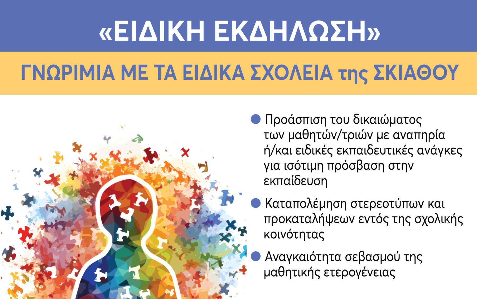 Ο Δήμος Σκιάθου, σε συνεργασία με τις Σχολικές Μονάδες Ειδικής Αγωγής, διοργανώνει την Κυριακή 7 Δεκεμβρίου 2025, στις 18:00, στην αίθουσα Δημοτικού Συμβουλίου στο Μπούρτζι ενημερωτική εκδήλωση με θέμα «Γνωριμία με τα Ειδικά Σχολεία της Σκιάθου».