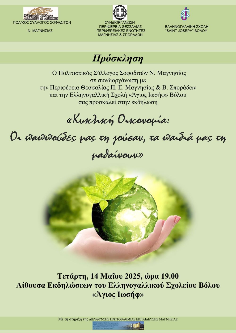 Ο Πολιτιστικός Σύλλογος Σοφαδιτών Ν. Μαγνησίας σε συνδιοργάνωση με τη Περιφέρεια Θεσσαλίας, Π.Ε. Μαγνησίας & Β. Σποράδων και την Ελληνογαλλική Σχολή «Άγιος Ιωσήφ» Βόλου, καθώς και με τη στήριξη της Διεύθυνσης Πρωτοβάθμιας Εκπαίδευση Μαγνησίας, ετοιμάζει εκδήλωση με τον τίτλο «Κυκλική Οικονομία: Οι παππούδες μας τη ζούσαν, τα παιδιά μας τη μαθαίνουν», που θα πραγματοποιηθεί την Τετάρτη, 14 Μαΐου 2025, ώρα 19.00, στην Αίθουσα Εκδηλώσεων του Ελληνογαλλικού Σχολείου Βόλου «Άγιος Ιωσήφ».