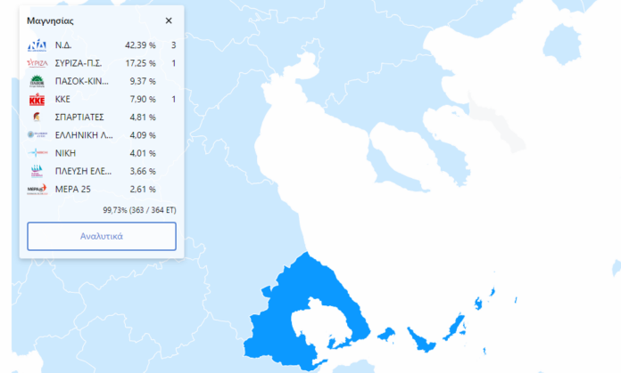 Πρώτευσε η Νέα Δημοκρατία σε όλους τους νομούς της Μαγνησίας υποχωρώντας ελαφρά στα ποσοστά της σε σύγκριση με τις εκλογές του Μαΐου. Ωστόσο αυτή τη φορά, οι Δήμοι επεφύλασσαν διάφορες εκπλήξεις με τους περισσότερους να βάζουν στην πρώτη δεκάδα των κομμάτων τον Πατριωτικό Συνασπισμό, αλλά και το Κίνημα Φτωχών Ελλάδας. Η ΝΔ κατέγραψε το υψηλότερο ποσοστό της στη Σκιάθο με 51,14%, Ρήγας Φεραίος και Σκιάθος πλάσαρε στην τέταρτη θέση τους Σπαρτιάτες, ενώ η Σκόπελος ανέδειξε δεύτερη δύναμη με ενισχυμένα ποσοστά το ΚΚΕ.