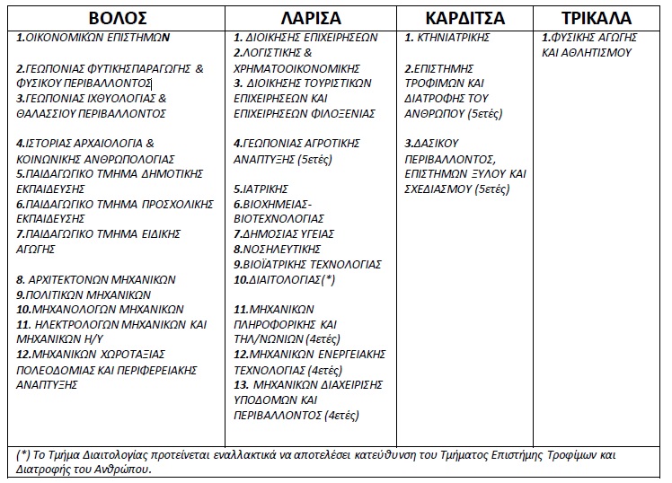 Από το ΤΕΙ Θεσσαλίας προτείνεται η παρακάτω γεωγραφική κατανομή των τμημάτων σύμφωνα με τον πίνακα: