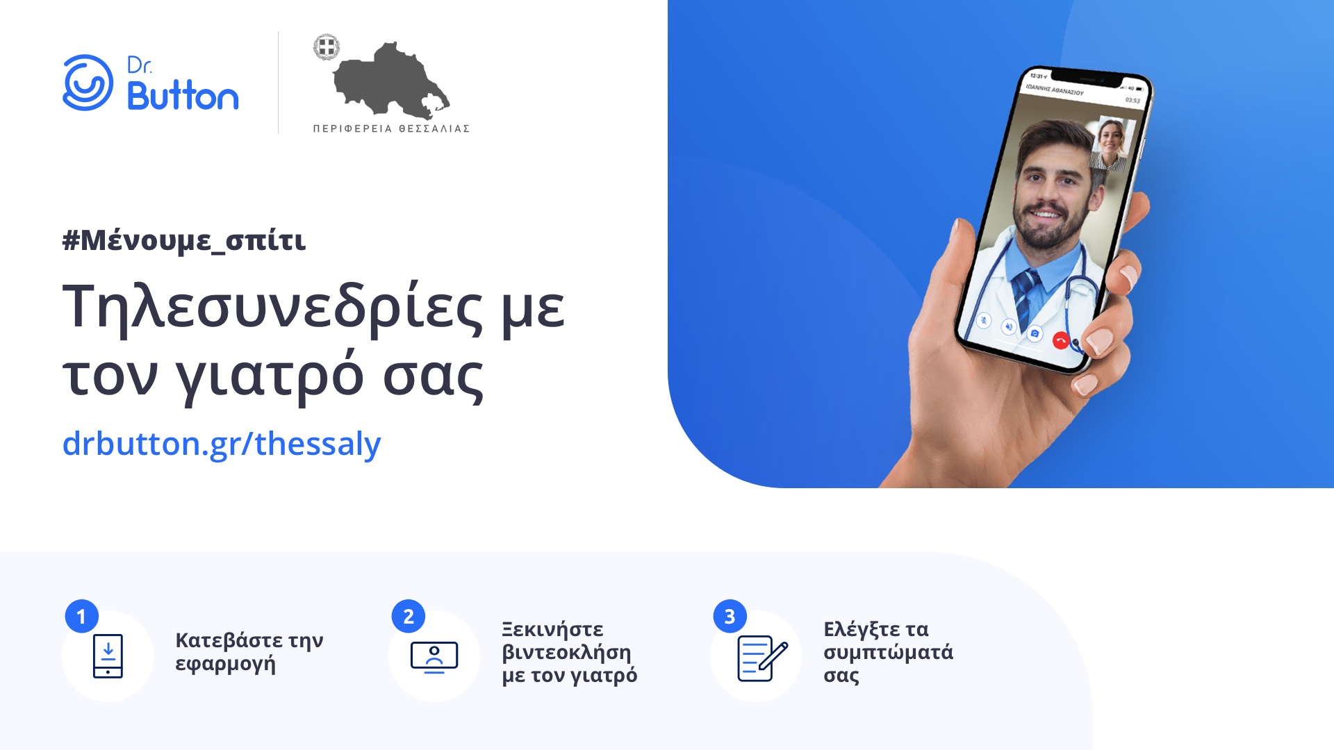 Η Περιφέρεια Θεσσαλίας φέρνει στο σπίτι κάθε ανθρώπου τον γιατρό, προσφέροντας δωρεάν σύστημα τηλεϊατρικής για την αντιμετώπιση της εξάπλωσης του κορωνοϊού. Ο Κώστας Αγοραστός καλεί όλους τους Θεσσαλούς να κάνουν πράξη το μήνυμα «Μένουμε Σπίτι», να αποφεύγουν τις άσκοπες μετακινήσεις και να χρησιμοποιήσουν τα εργαλεία της νέας τεχνολογίας για να ζητήσουν άμεσες συμβουλές και αξιόπιστη ιατρική καθοδήγηση μέσα από τη σύστημα Dr Button.