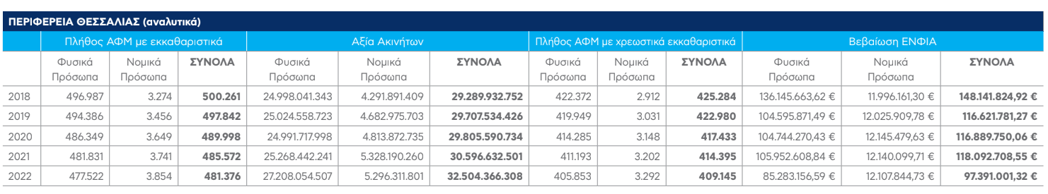 Για την Περιφέρεια Θεσσαλίας τα συγκεντρωτικά ποσά είναι τα εξής: Το πλήθος των ΑΦΜ με εκκαθαριστικά ανέρχεται στα 481.376 άτομα, ενώ με χρωστικά εκκαθαριστικά στα 409.145. Η αξία των δηλωθέντων ακινήτων είναι 32.504.366.307,71 € και το πόσο επιβεβαίωσης ανέρχεται στα 97.391.001,32 ευρώ. Η αξία των ακινήτων φέτος είναι μεγαλύτερη σε σχέση με τα περσινά δεδομένα, ενώ το ποσό που καλούνται να καταβάλουν στο σύνολο οι φορολογούμενοι είναι μικρότερο, εφόσον πέρσι το ποσό αυτό ανερχόταν στα 118.092.708,55 ευρώ.